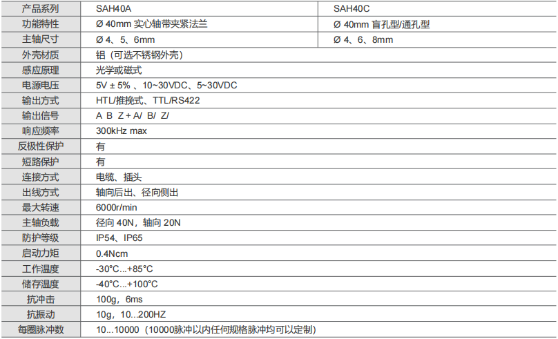 外形尺寸40mm實心軸型,盲孔型或通孔型編碼器雙軸承設計、防護等級高達IP67脈沖數最高可達10000P/R特別適合空間狹窄的環境,減小安裝空間具備反短接和短路保護、有效降低安裝錯誤對編碼器造成影響