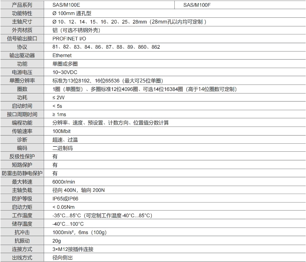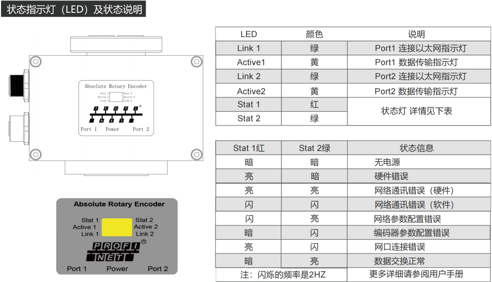 大通孔總線型輸出,讓安裝更為簡單高精度光學感應技術,單圈或多圈編碼器單圈分辨率最高可達25位,多圈圈數標準高達14ProfiNet I/O總線最大速率100Mbit,版本為2.44位,或定制更高圈數超強的抗磁場干擾能力,LED狀態顯示具備反短接和短路保護、有效降低安裝錯誤對編碼器造成影響