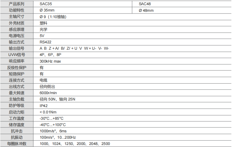 精確的光電感應信號級數可達8級脈沖數2500P/R防護等級可達IP42長度僅有0.25m的電纜出線塑料外殼,更加輕便和節省成本通孔軸徑為? 9銅錐軸、軸套型更加緊湊,節省空間特殊的錐形軸設計使得安裝更為方便運行更為穩定具備反短接和短路保護、有效降低安裝錯誤對編碼器造成影響