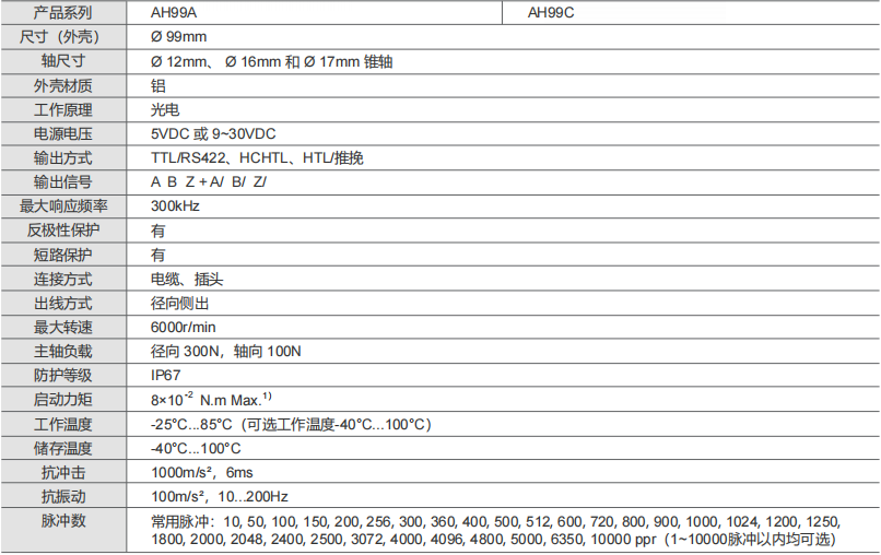 AH99重載型增量編碼器具有防雷擊、過壓、過流、浪涌沖擊保護外殼具有防護等級 IP67的堅固外殼、可防止受到灰塵和液體的污染。用于危險環境的型號通過ATEX認證每圈脈沖數最高可達10000P/R可提供雙重輸出模塊,帶有雙重掃描傳感器和兩個電氣隔離的電子電路該雙重輸出信號可用于兩種不同功能的獨立系統,或者用于獲得冗余信號用軸向螺釘固定的空心軸。軸尺寸:?12 mm、 ?16 mm和?17 mm 錐軸。絕緣PEEK軸襯、用于防止軸承受到軸電流的影響扭矩支架有多種方向的型號可供選擇,用于固定扭臂。獨立后蓋、用于將電纜線連接到螺釘型端子充足的空間、方便于在連接電纜時進行處理操作。 M23 連接器或預裝電纜(帶或不帶連接器)